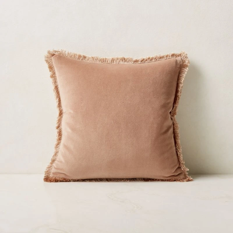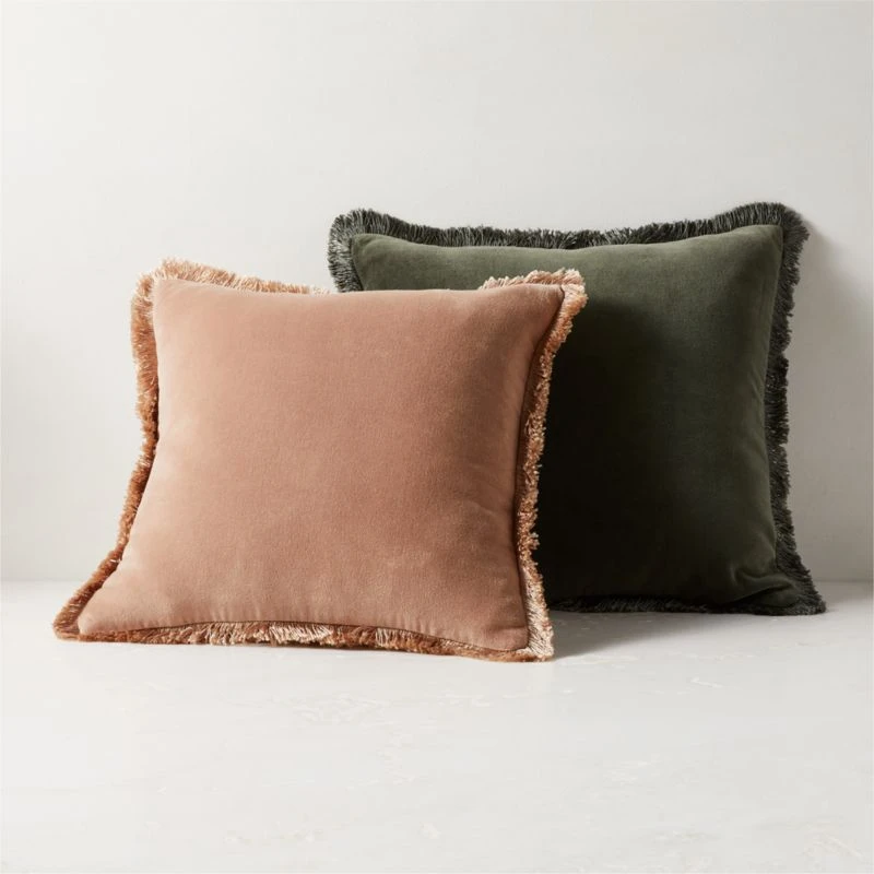 Rich tonal color is the secret to this seriously luxe throw pillow. Camel velvet is edged in a fringe of light brown for a look that’s polished and pulled together. CB2 pillows include a pillow insert in your choice of feather down or down alternative. CB2 exclusive.
