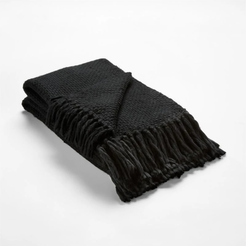 Sophisticated black throw blanket is woven by hand with chunky texture and finished with fringe. The tightly woven basket weave detail adds dimension and understated luxury. CB2 exclusive.