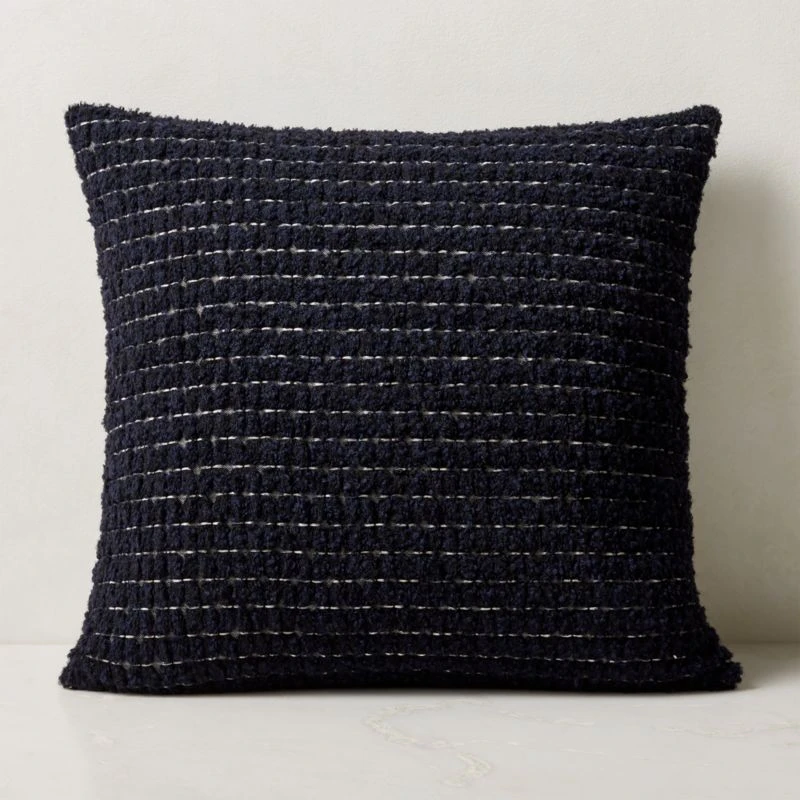 Throw pillow’s intricate weave brings out the beauty and texture of its materials. Curly yarn is reactive-dyed to create rich tones of navy, white and black. CB2 pillows include a pillow insert in your choice of feather down or down alternative. CB2 exclusive.