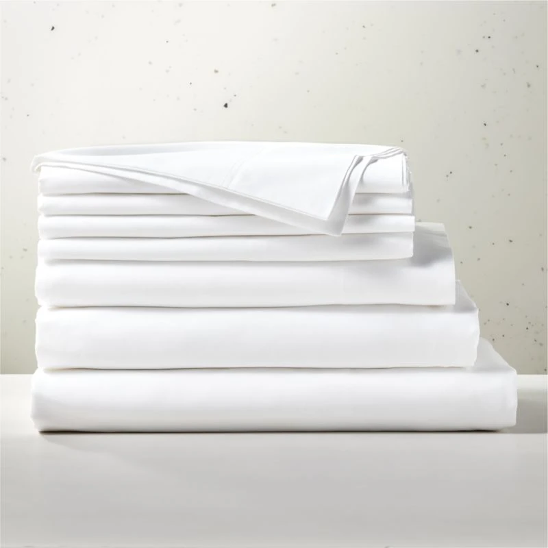 Luxuriously weighty with a silky finish, sateen 520-thread-count bedding offers subtle luster in crisp white. Made of premium organic cotton, the tight sateen weave resists wrinkles and provides warmth, making it ideal for colder nights and those who sleep cool. Set includes one duvet cover, one fitted sheet, one flat sheet, two pillowcases and two shams. CB2 exclusive.