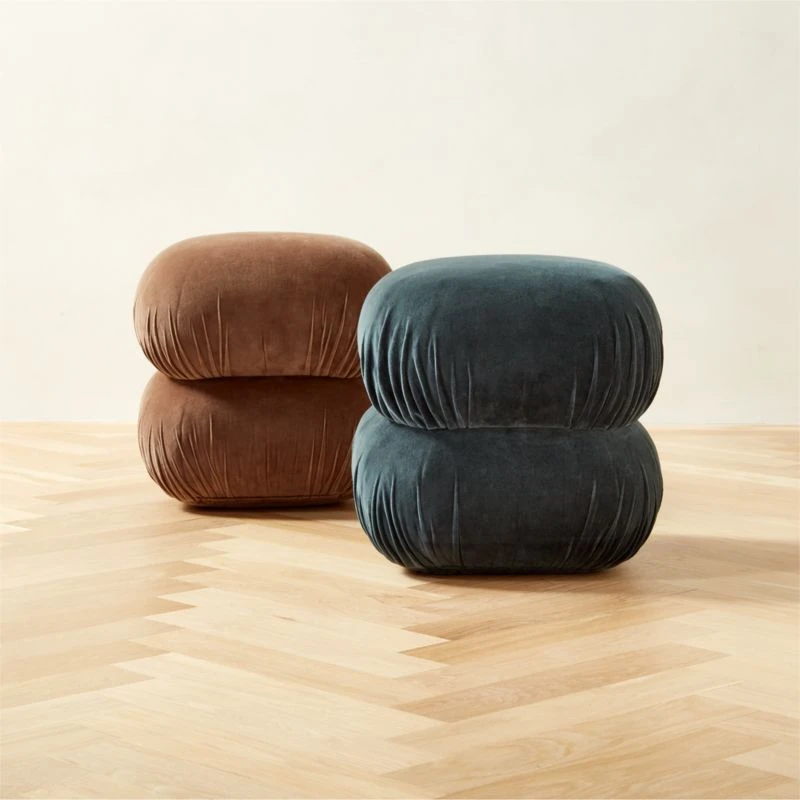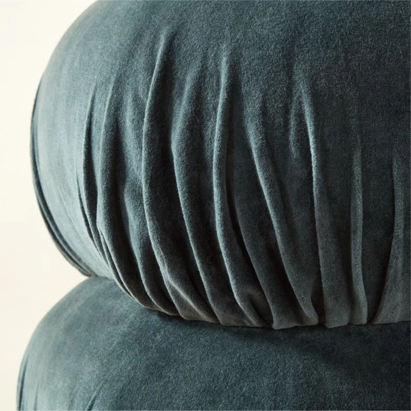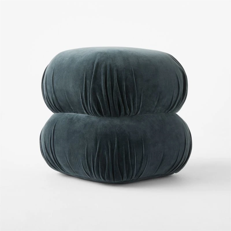 Featuring a luxe ruched detailing, teal-colored velvet pouf makes an elevated statement in any room. CB2 exclusive.