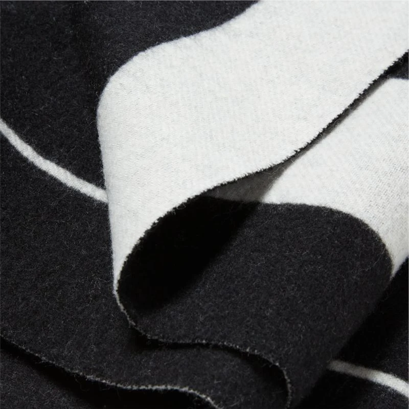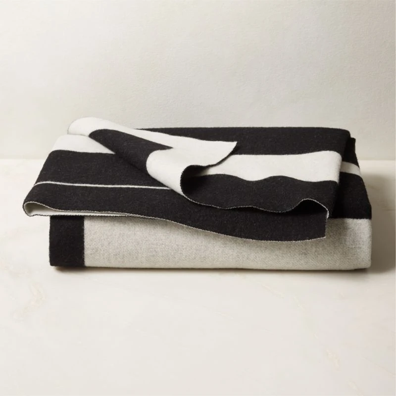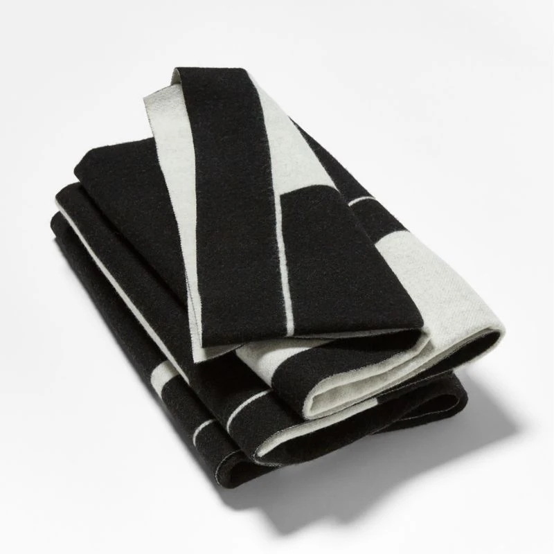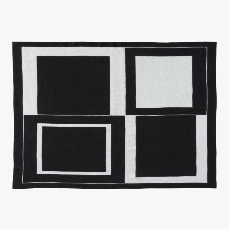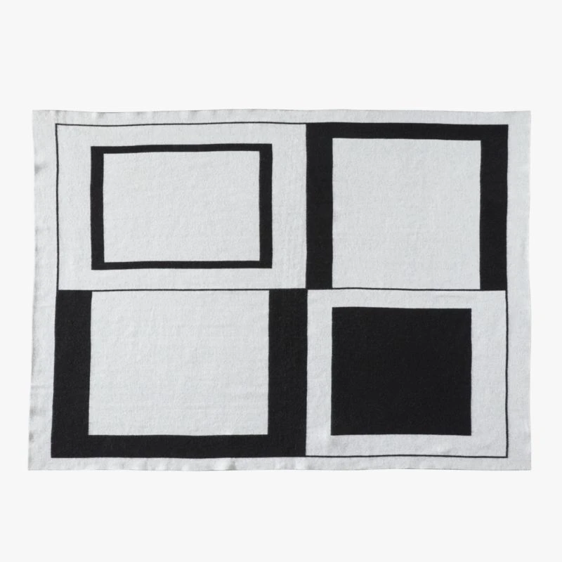 Reversible throw blanket by Los Angeles design studio Transition State is woven of 100% merino wool for superior warmth and softness. Black and white rectangular pattern reverses colors on the opposite side for a two-in-one look. CB2 exclusive.