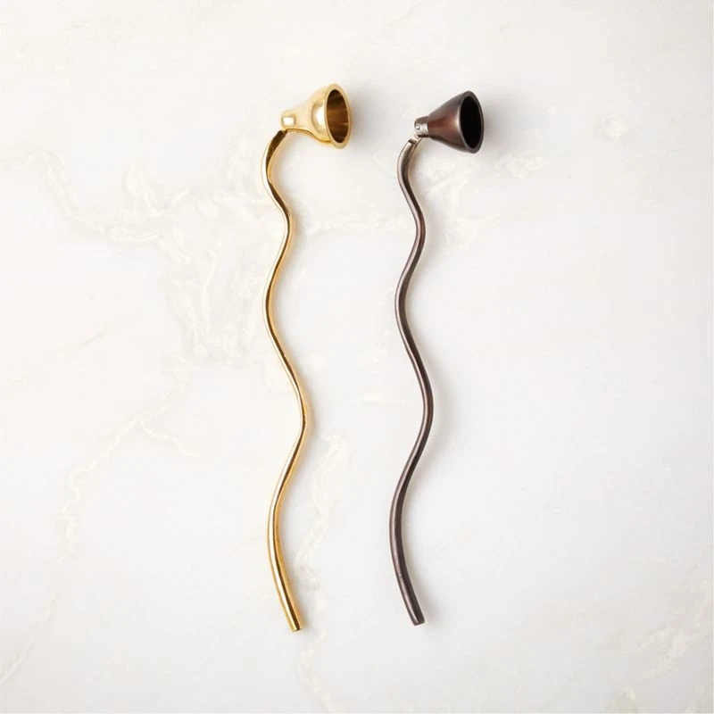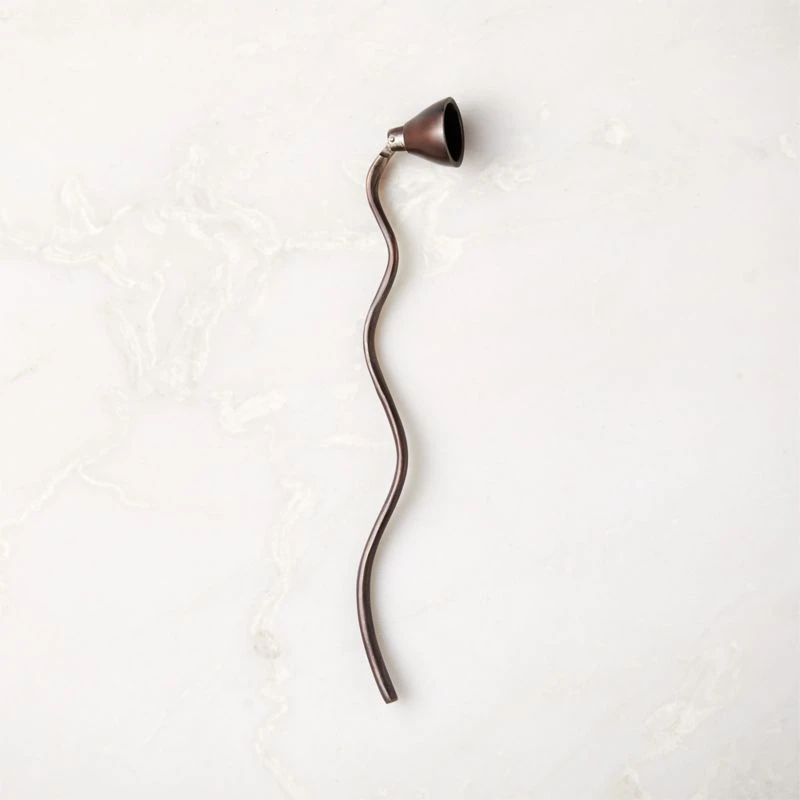 Dramatic in blackened brass, candle snuffer’s wavy handle has a postmodern feel. CB2 exclusive.