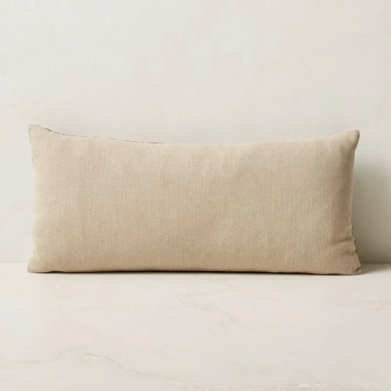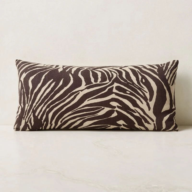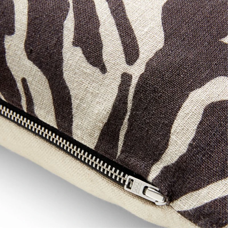 Printed linen throw pillow by Brett Beldock has freewheeling style. Abstract zebra-inspired print is a maximalist’s dream, while an exposed silver zipper and solid natural linen back further heighten the style. CB2 pillows include a pillow insert in your choice of feather-down or down alternative. CB2 exclusive.
